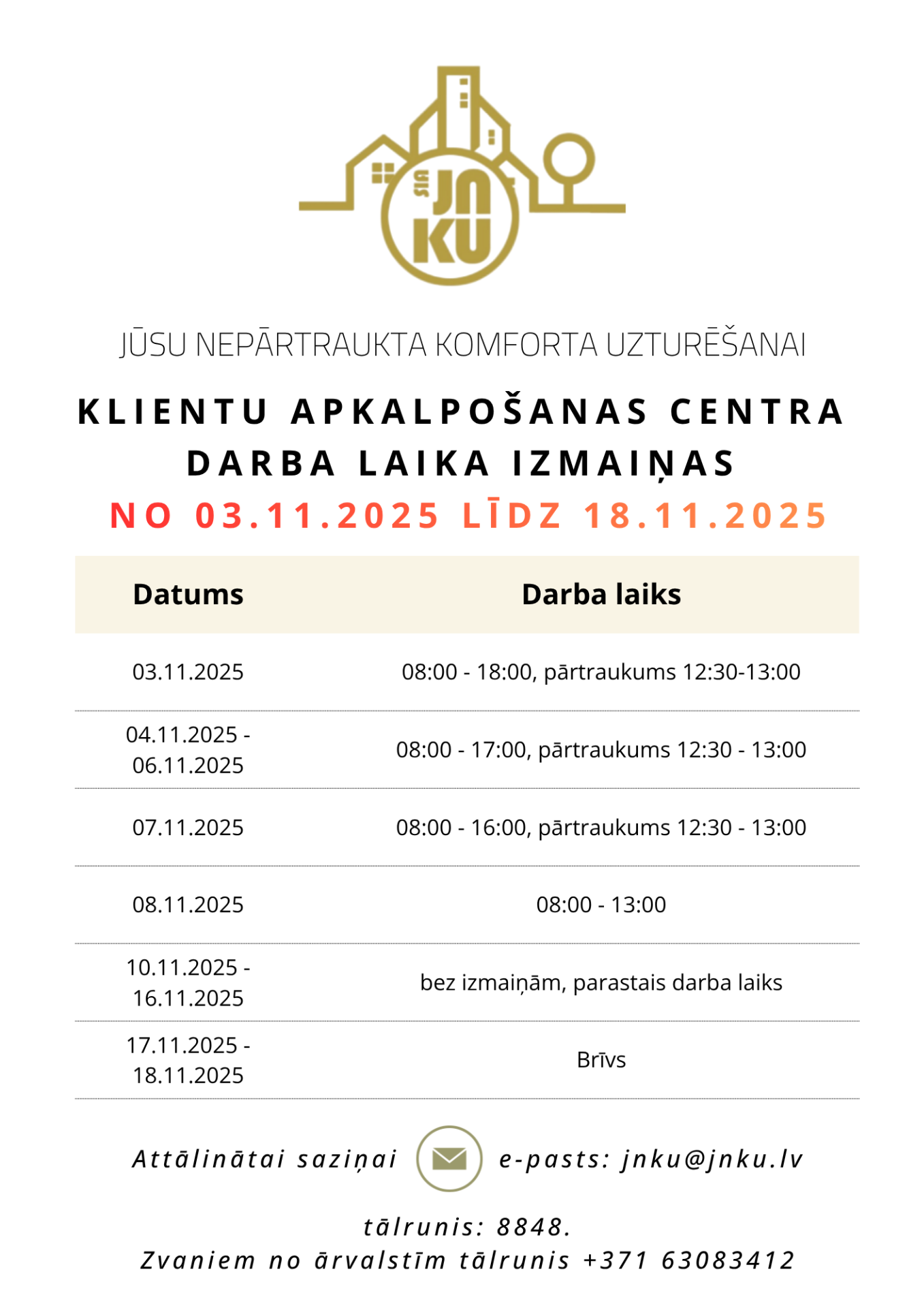 Par izmaiņām darba laikā no 3.-18. novembrim
