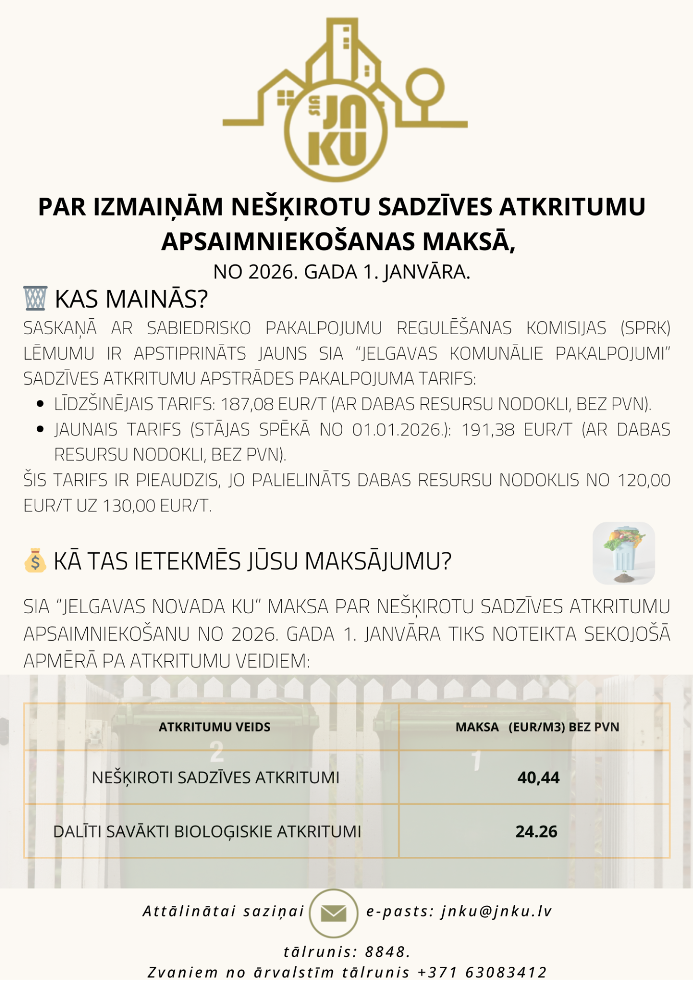 SIA "Jelgavas komunālie pakalpojumi" Sabiedrisko pakalpojumu regulēšanas komisijai iesniedza nešķirotu sadzīves atkritumu apstrādes pakalpojuma tarifa projektu, kas varētu stāties spēkā ar 01.07.2025. Plašāka informācija šeit