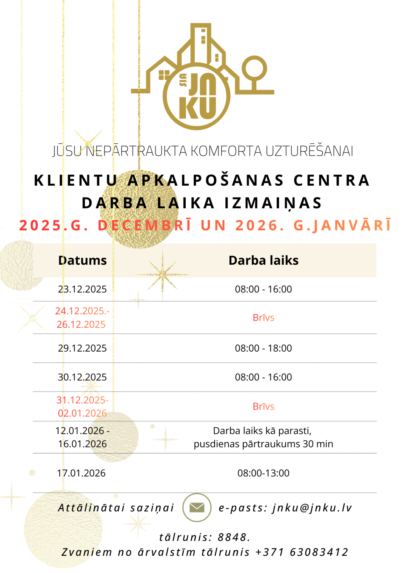 SIA Jelgavas novada KU informē, ka apkure JNKU apsaimniekotajās mājās ir pieslēgta. Neskaidrību gadījumā lūdzam sazināties e-pastā jnku@jnku.lv vai zvanot pa tālruni 8848
