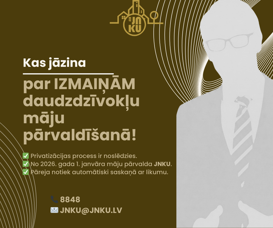 - JNKU speciālists: "Sveiks, Jāni! Dzīvokļu īpašniekiem līdz 2025. gada 31. decembrim bija pienākums pieņemt lēmumu: vai māju pārvaldīs paši īpašnieki, vai tiks izvēlēts cits pārvaldnieks. To varēja izdarīt, sasaucot kopsapulci vai piedaloties aptaujā."