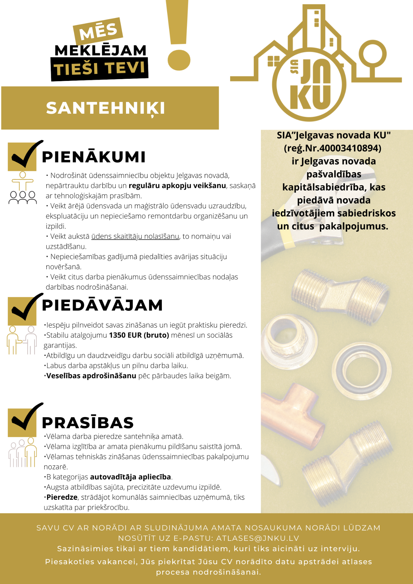 Savu CV ar norādi "santehniķis " lūdzam nosūtīt uz e-pastu: atlases@jnku.lv