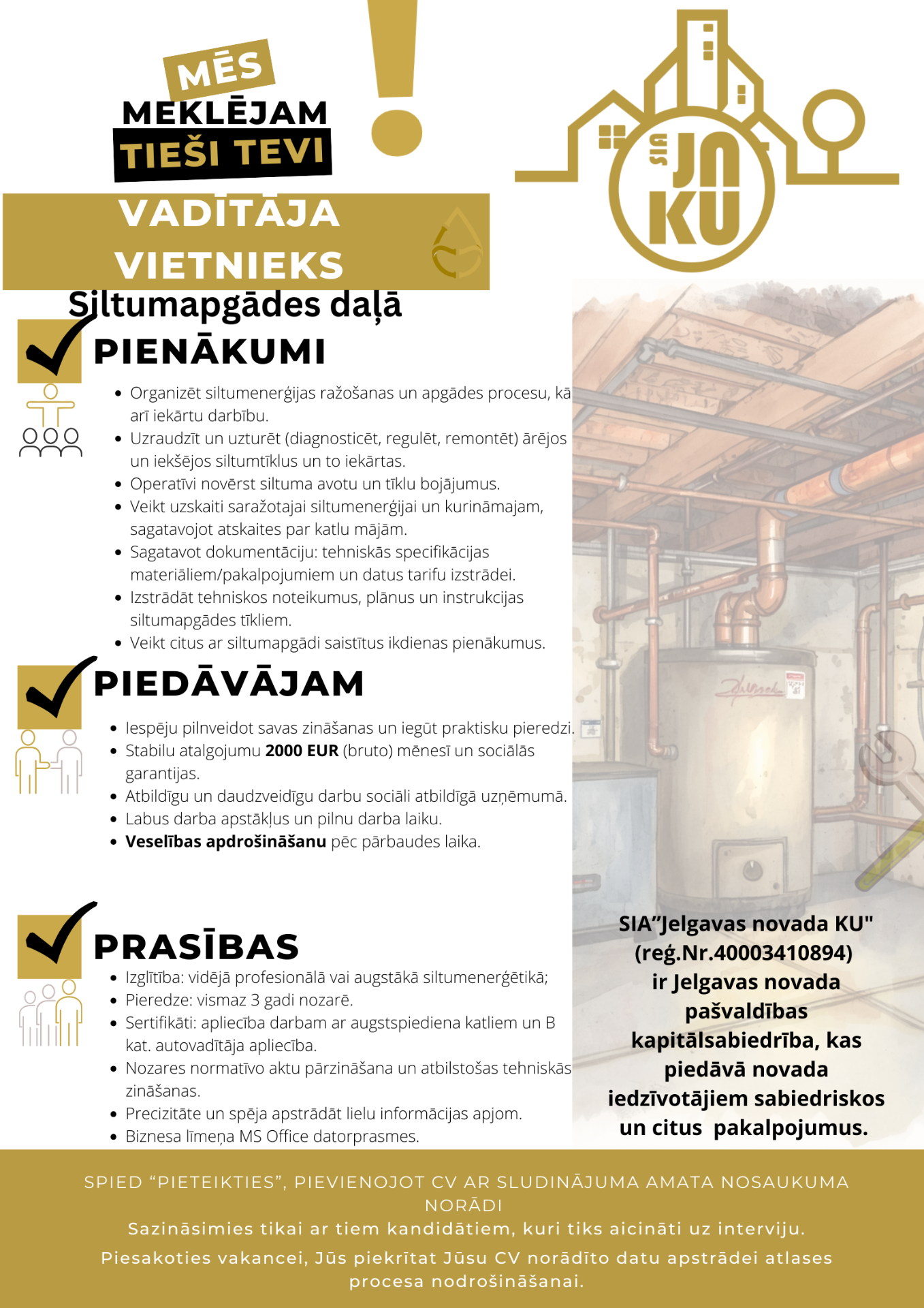 Savu CV ar norādi "siltumapgādes daļas vadītāja vietnieks" lūdzam nosūtīt uz e-pastu: atlases@jnku.lv līdz 29.03.2026.